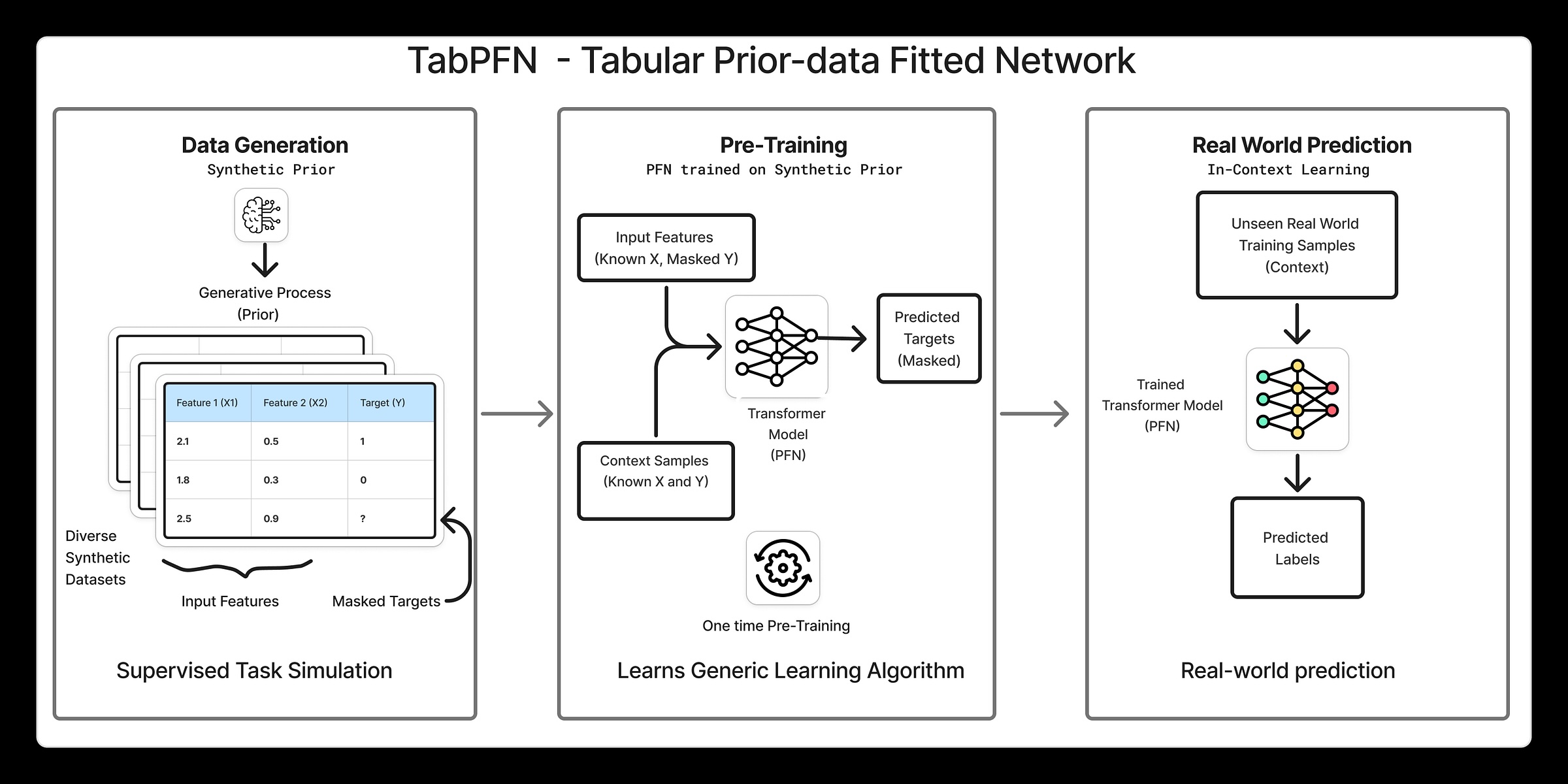 TabPFN utilises in-context studying to suit a neural community to a previous over tabular datasets. What this implies is that as an alternative of studying one activity at a time, the mannequin learns how tabular issues are inclined to look on the whole after which makes use of that information to make predictions on new datasets via a single ahead go. Right here is an excerpt from TabPFN’s Nature paper: