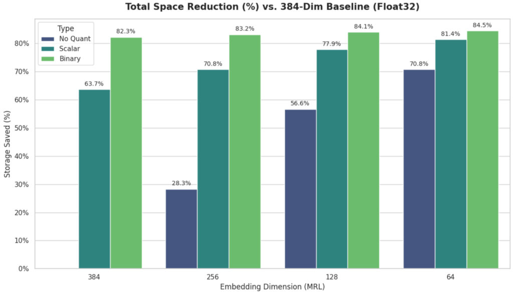 Lastly, Binary Quantization: As anticipated, it offers probably the most excessive area reductions however suffers from a large drop in retrieval metrics. In consequence, it’s far more useful to use MRL plus Scalar Quantization to realize comparable area discount with a minimal trade-off in accuracy. Primarily based on the experiment, it’s extremely preferable to make the most of decrease dimensionality (128d) with Scalar Quantization—yielding a 77.9% area discount—quite than utilizing Binary Quantization on the unshortened 384-dimensional index, as the previous demonstrates considerably larger retrieval high quality.